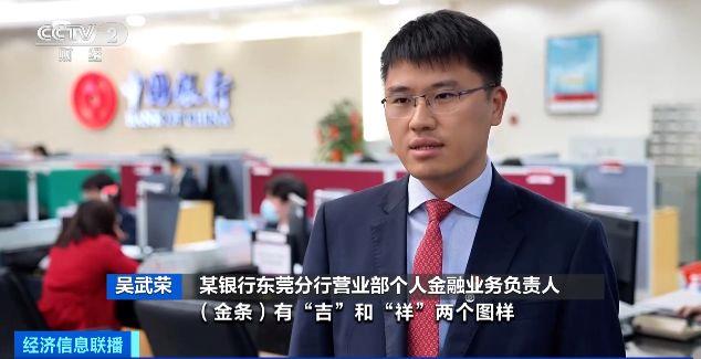 某银行东莞分行营业部个人金融业务负责人 吴武荣:我们分行今年以来吉祥金条销量同比增幅近50%,金条有“吉”“祥”两个图样,价格相对于各类品牌金店来说,优惠6%左右。