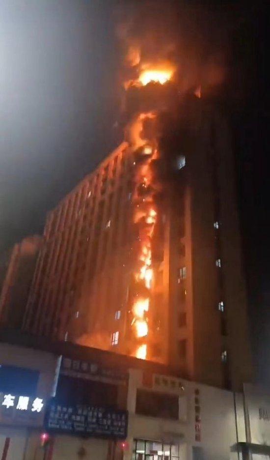 据多段现场视频显示,起火高层疑似为同一单元多个房间起火燃烧,现场浓烟滚滚。其中一段视频的画外音称:“从1楼到17楼,全都(烧)透了。”而在起火高层下方,有七八辆消防车进行处置。