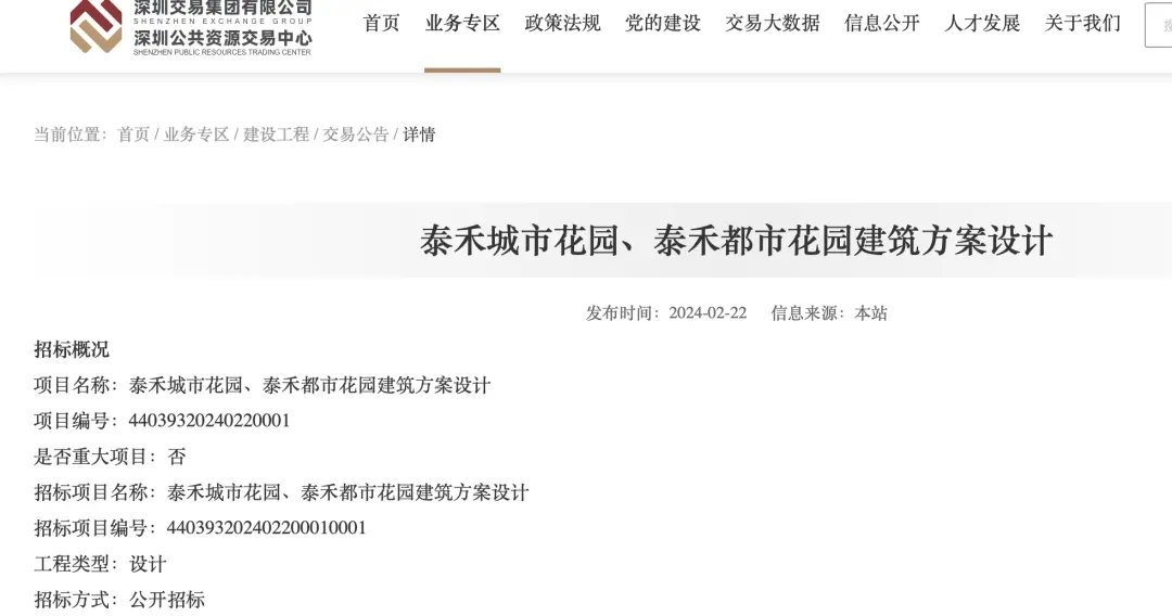 2月22日,深圳交易集团官网发布泰禾城市花园、泰禾都市花园建筑方案设计招标信息,建设单位为深圳泰禾房地产开发有限公司(以下简称深圳泰禾)。