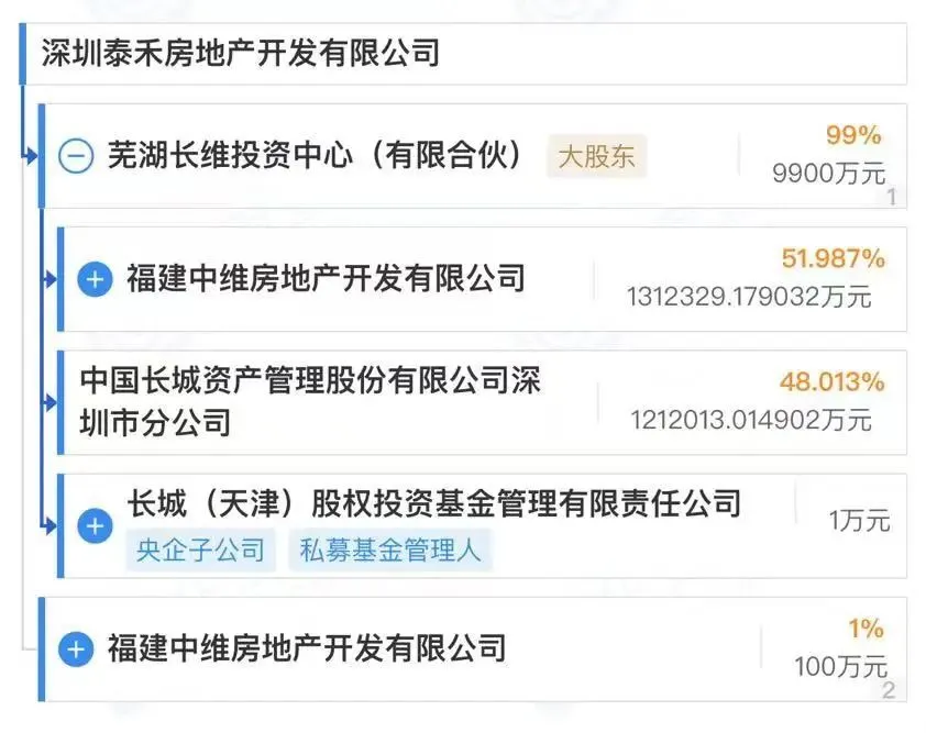据企查查,按照最新认缴出资情况,芜湖长维投资中心为大股东,直接持股比例高达99%;泰禾实控的福建中维房地产开发有限公司,认缴出资额仅为100万元,直接持股比例1%。而芜湖长维投资中心股权穿透之后,长城资管持股比例达48%。