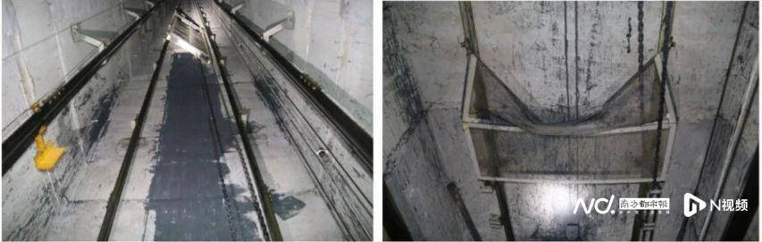 电梯井内对重块脱离轨道,电梯井靠洞口一侧墙壁有油漆涂抹痕迹;电梯井底南侧墙面的对重护网严重变形。