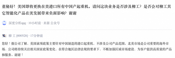 2月23日,有投资者在互动平台向柳工提问:美国即将更换在美港口所有中国产起重机,这块业务是否涉及柳工?