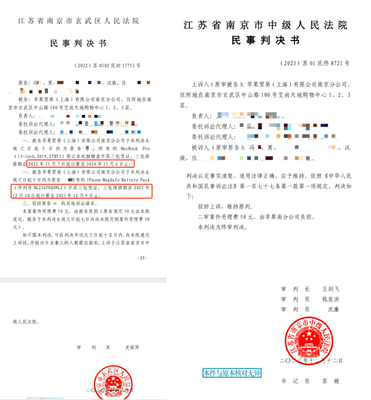 法院判决,苹果南京分公司应为冯先生重新计算保修期。受访者供图