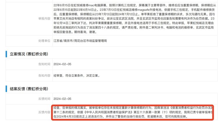 上游新闻记者查询中国执行信息公开网发现,目前苹果南京分公司已被南京市玄武区人民法院列为被执行人。另据南京市雨花区市场监督管理局2月5日回复,经查,冯先生举报的情况属实,苹果南京分公司存在未按规定重新计算保修期的行为,因商家违反《侵犯消费者权益行为处罚办法》的相关规定,依据《消费者权益保护法》的规定,已责令苹果南京分公司在2024年4月3日前改正上述违法行为,并作出了警告的当场行政处罚。