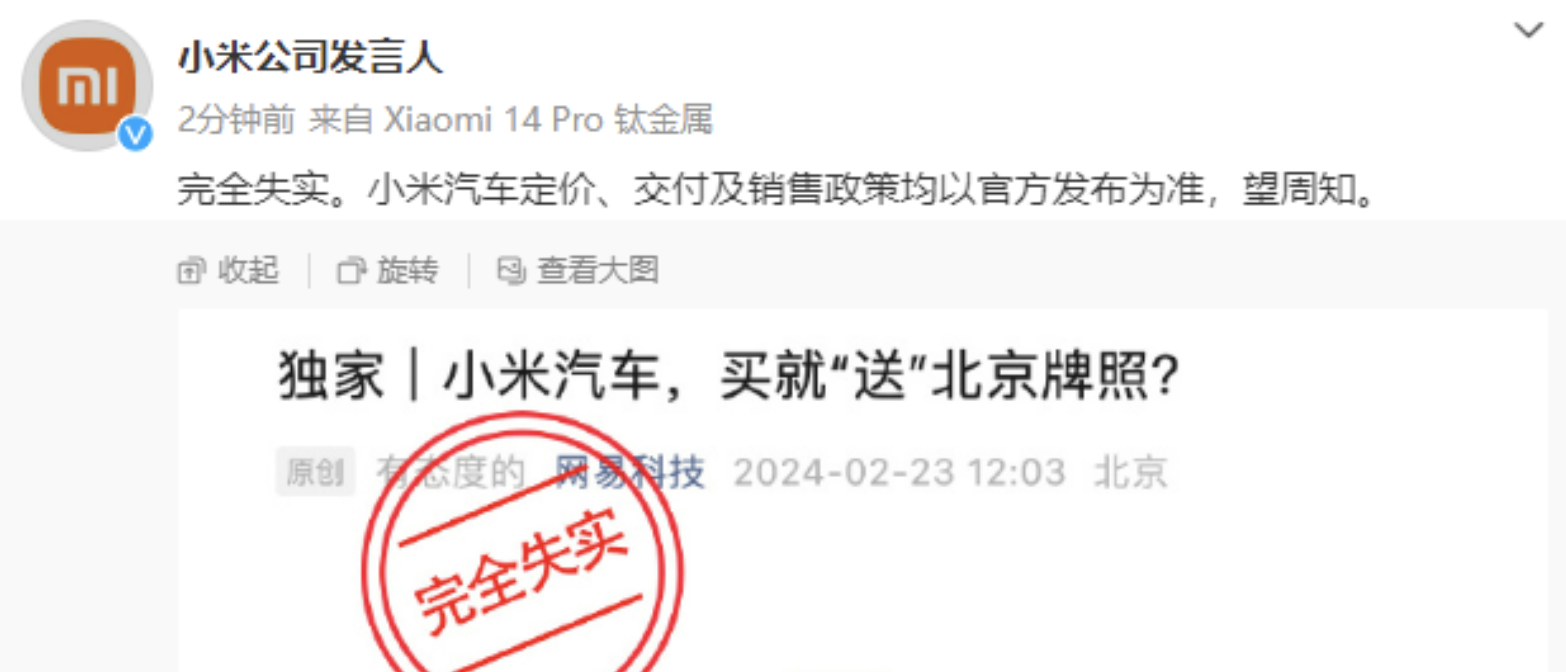 @小米公司发言人发文回应称,完全失实。小米汽车定价、交付及销售政策均以官方发布为准,望周知。