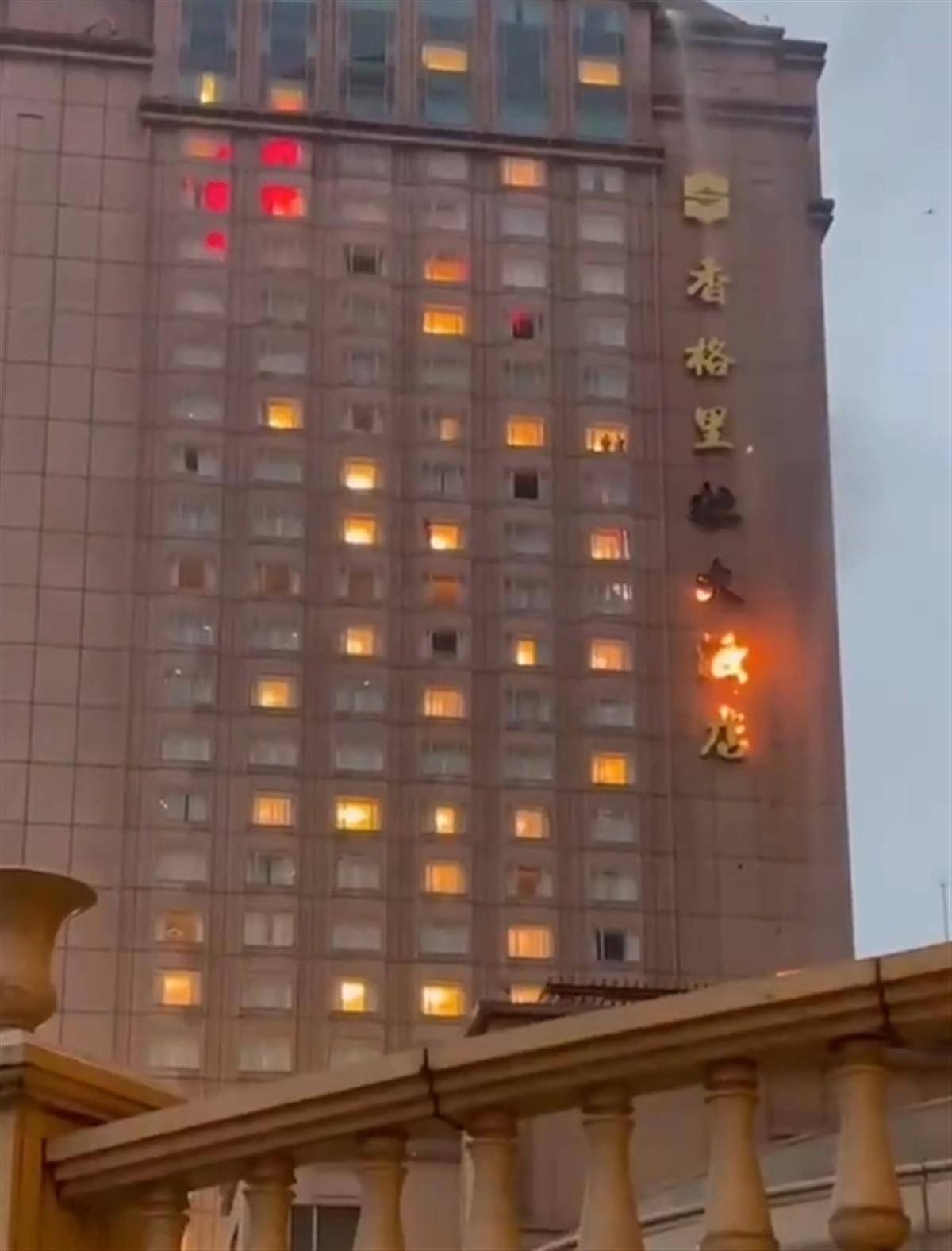 现场视频显示,浦东新区香格里拉大酒店的七字招牌中,“大酒店”三个字上仍能看到有明火,“拉”字已经被烧黑。