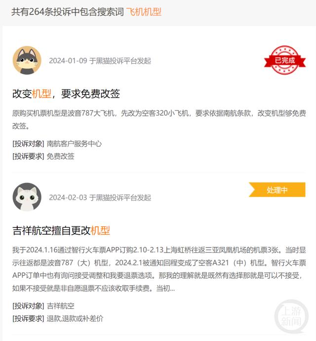 上游新闻记者通过黑猫投诉查询发现,不仅上述海航、东航存在“售票大飞机执飞小飞机”的情况,国航、深航、川航、吉祥航空等均在投诉之列。2023年1月,一名旅客预订深航空客330大飞机,无故调整为空客320中型机,且价格下调100元一位。该旅客投诉至客服,未给予处理。