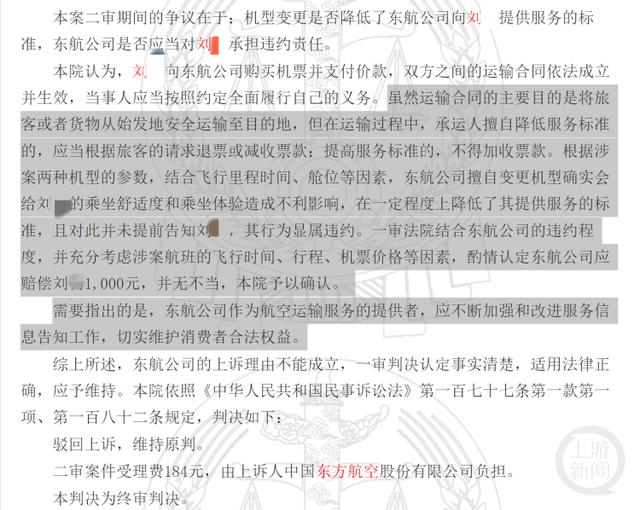 上游新闻记者查询中国裁判文书网发现,曾有旅客因为买票时是大飞机执飞时变成小飞机,将航空公司告上法庭。经法院一审二审裁决,判令航空公司赔偿该旅客1000元。