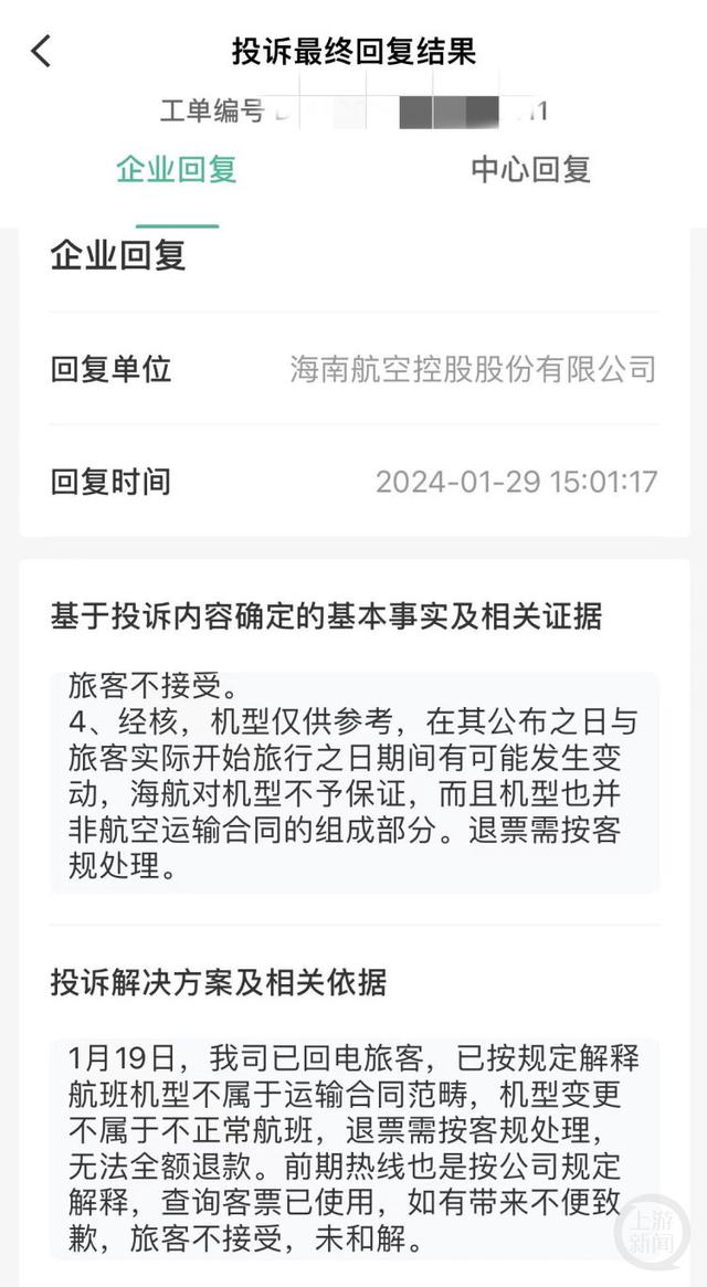 事后,他将海航投诉至民航质量监督服务热线12326。易先生提供的截图显示,1月19日,海航回复称,该司已按规定解释航班机型不属于运输合同范畴,机型变更不属于不正常航班,退票需按客规处理,无法全额退款,“前期热线也是按公司规定解释,查询客票已使用,如有带来不便之前,旅客不接受,未和解。”