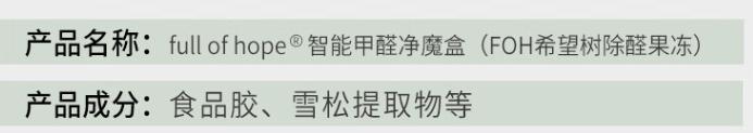 据希望树电商旗舰店产品详情页面描述,这款“full of hope智能甲醛净魔盒(FOH希望树除甲醛果冻)”的产品成分为食品胶、雪松提取物等。消费者晒图也显示,其主要成分为食品胶、雪松提取物、稳定剂、激活液等。