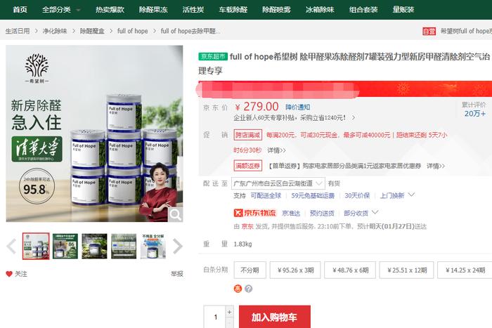 去除甲醛产品是“智商税”重灾区,尤其“除醛果冻”“除醛魔盒”这类网红产品受到较多争议,但电商平台上的销量动辄几十万。例如1款“full of hope希望树 除甲醛果冻”产品,销量高达20万+,在短视频平台更是有诸多推荐。
