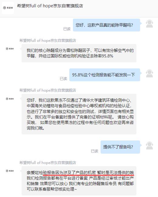 希望树除醛果冻详情页面宣称“甲醛去除率95.8%”,但只有模糊的检测报告截图,《消费者报道》记者向客服索要完整检测报告,客服回复:“检验报告因为涉及了产品的机密,暂时无法提供。”