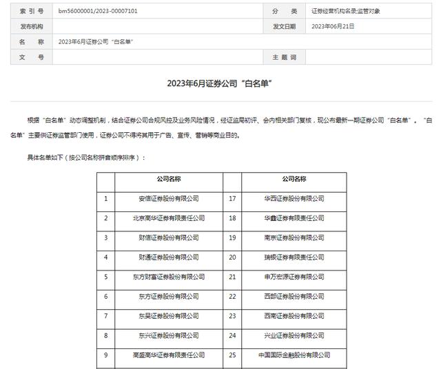 2021年5月,为落实分类监管要求,压实证券公司内控合规主体责任,提升监管有效性,推动证券行业高质量发展,证监会对公司治理、合规风控有效的证券公司实行“白名单”制度,并于当月开始公布券商“白名单”,首批有29家券商入围。