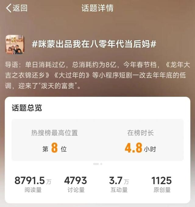 2月22日,微博话题“咪蒙一个寒假靠2部短剧收入过亿”和“咪蒙出品我在八零年代当后妈”的阅读量均超7000万。