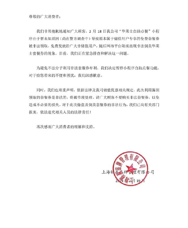2月19日,华莱士发布公告称,由于暂未知原因(尚在警方调查中),导致原本属于储值用户专享的免费套餐券被非法领取,免费发放给了广大非储值用户,随后网络平台陆续出现非法倒卖华莱士套餐券的现象。