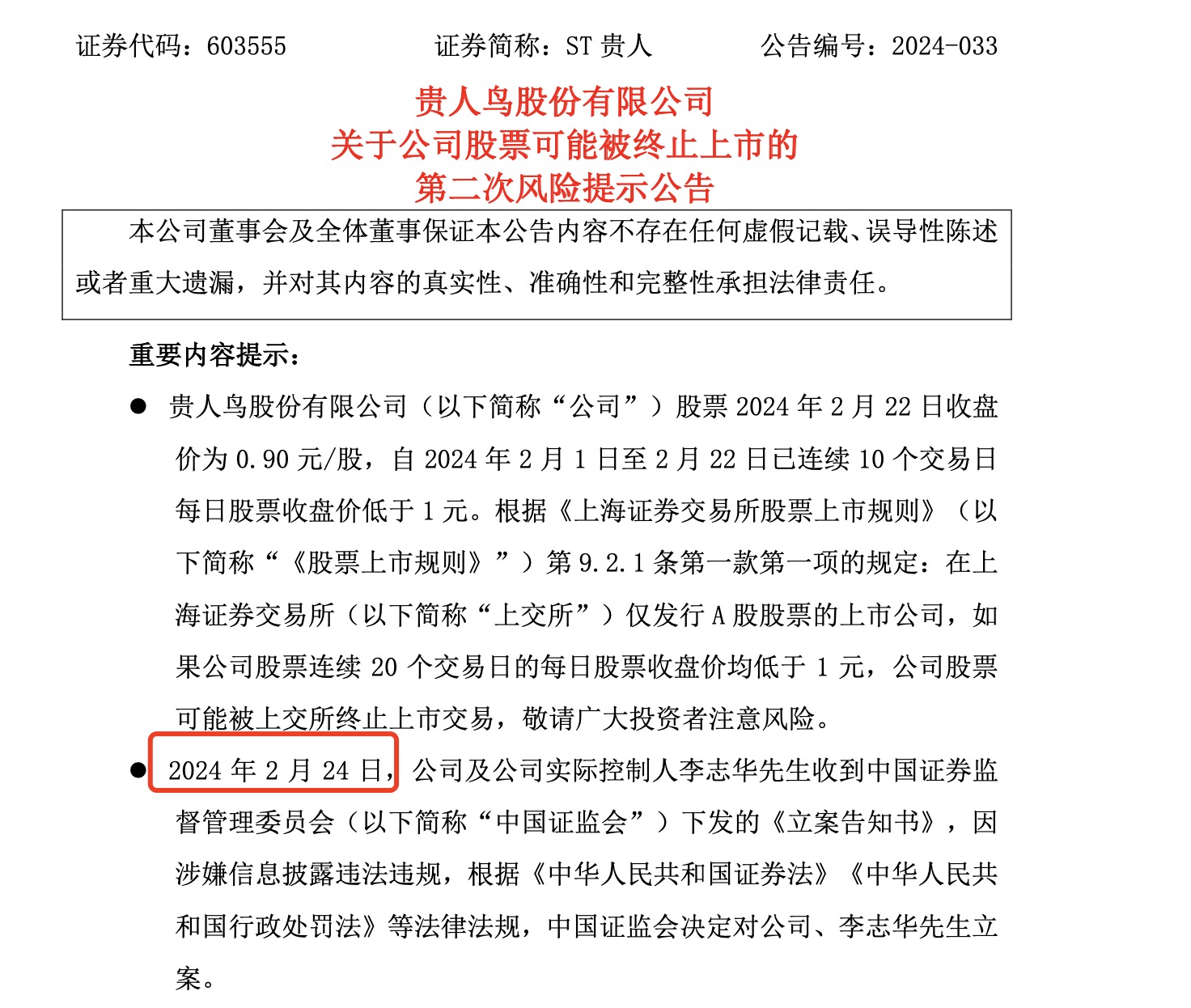 滑落退市边缘的ST贵人(603555.SH)及实控人李志华因涉嫌信息披露违法违规,今日正式收到证监会下发的《立案告知书》。然而,在公司今晚的公告中,收到告知书的时间竟写作“2月24日”,也就是两天后。对此,有股民调侃“迫不及待”。