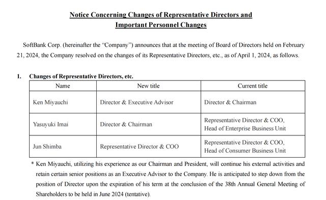 2月21日,软银集团(SoftBank Group)旗下通信子公司“软银公司”(SoftBank Corp)宣布,董事长宫内谦(Ken Miyauchi)将于4月1日卸任董事长一职,出任执行顾问,并预计将在6月举行的股东大会结束时卸任董事职务。董事兼首席运营官今井康之将接任董事长一职,而宫内则将担任执行顾问。