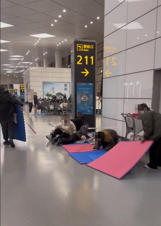 网传视频显示,在机场候机大厅的211登机口附近,不少旅客躺在泡沫垫上休息、睡觉。视频发布者在评论区解释,南航的飞机延误了,旅客希望南航能够安排住宿。“给我们几张垫子,老人孩子躺在地上休息,像什么样子。说是酒店爆满没有位置了,硬是让我们通宵到第二天早上6点半飞了,干等十几个小时,老人孩子真遭罪了。”