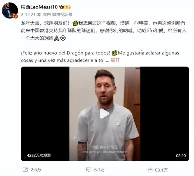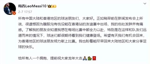 此前,梅西因在跟随迈阿密在中国香港行的表演赛中未登场引发热议。2月7日和2月19日,梅西两次发文讲述当时情况,称自己有伤在身所以无法上场。