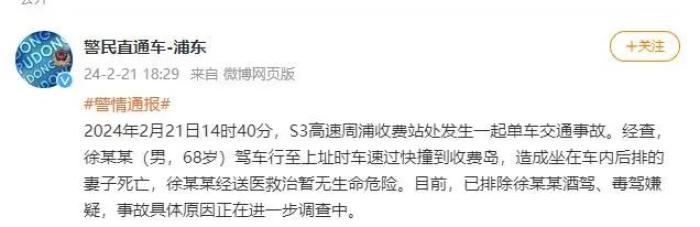 今天傍晚,浦东区公安分局发布通报称,今天14时40分,S3高速周浦收费站处发生一起单车交通事故。经查,徐某某(男,68岁)驾车行至上址时车速过快撞到收费岛,造成坐在车内后排的妻子死亡,徐某某经送医救治暂无生命危险。
