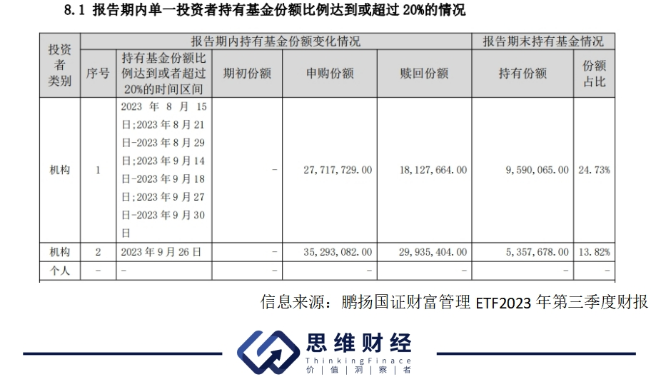 从鹏扬国证财富管理ETF基金2023年第三季度的财报来看,披露的单一投资者持有基金份额比例达到或超过20%的两家机构,报告期内的申购份额远大于赎回份额。也就是说,2023年第三季度,更多的散户投资者进行了赎回行为,导致规模骤降。