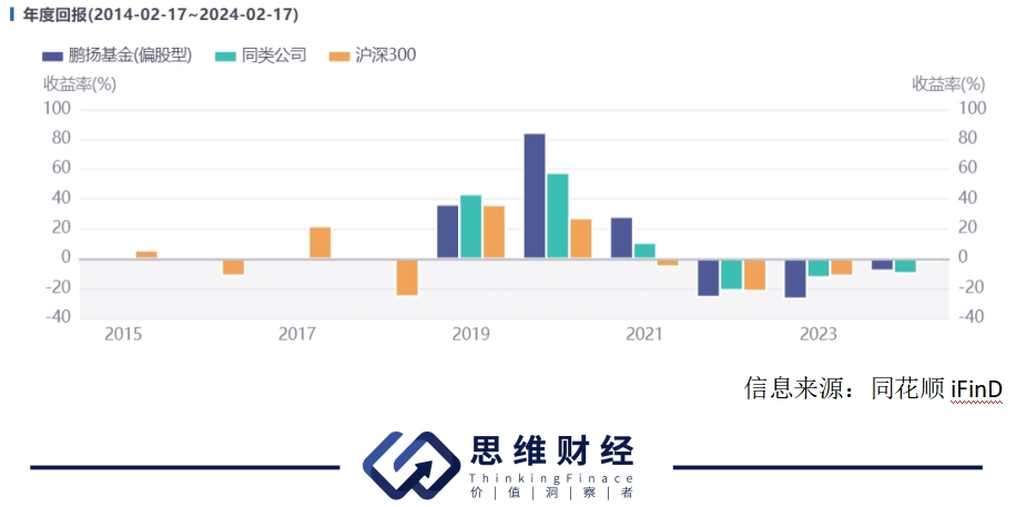 年度回报来看,2022年、2023年,鹏扬基金偏股型产品的收益率跑输同类公司,分别为-25.67%、-26.78%,而同类公司分别为-21.06%、-26.78%。