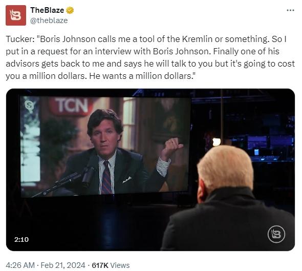 综合外媒消息,近日,美国记者卡尔森在接受美国新闻网站“TheBlaze”的采访时透露,他此前曾试图采访英国前首相约翰逊,但约翰逊要卡尔森支付100万美元才同意接受采访。