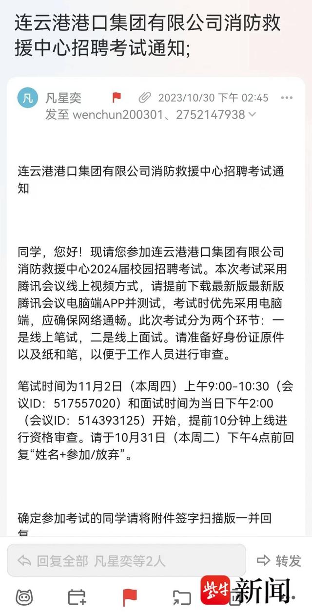 小温告诉记者,他是连云港灌南人。2023年10月份,连云港港口集团官网进行校招。小温想,如果能回到老家工作那多好啊,于是他积极报了名。根据自己的专业以及对方设置应聘条件及招聘岗位,他选择了应聘连云港港口集团有限公司消防救援中心办事员一职。记者在连云港港口集团有限公司招聘职位表附件1上看到,第29个职位办事员的专业需求为“汉语言、汉语言文学、秘书学、新闻学等相关专业”。