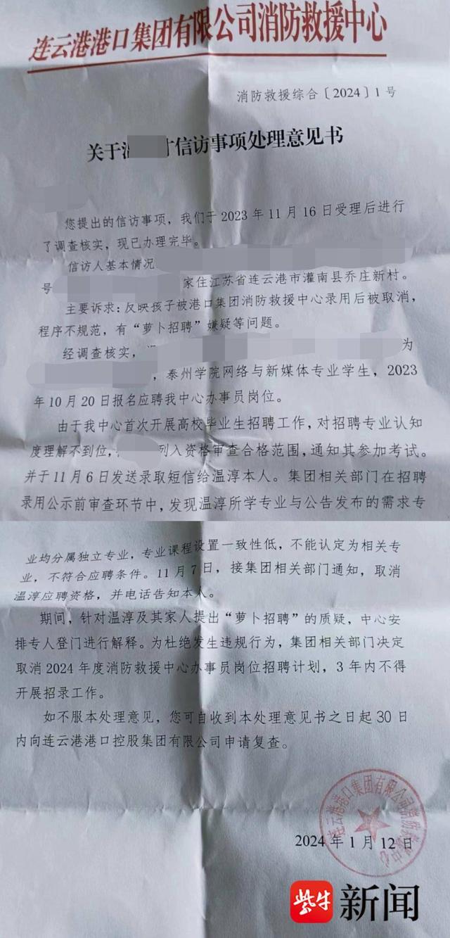 小温的爸爸温彦才得知小温的遭遇后,他也是怎么都想不明白,于是他从灌南赶到连云港港口集团有限公司消防救援中心,想当面问个清楚。记者通过该中心今年1月12日给温彦才的信访事项处理意见书上看到,经过调查,由于该中心首次开展高校毕业生招聘工作,对招聘专业认知度理解不到位,将温淳列入资格审查合格范围,通知其参加考试并于去年11月6日发送录取短信给温本人。集团相关部门在招聘录用公示前审查环节中,发现温淳所学专业与公告发布的需求专业均分属独立专业,专业课程设置一致性低,不能认定为相关专业,不符合应聘条件。去年11月7日,接集团相关部门通知,取消温淳应聘资格,并电话告知本人。其间,针对温淳及其家人提出“萝卜招聘”的质疑,中心安排专人登门进行解释。为杜绝发生违规行为,集团相关部门决定取消2024年度消防救援中心办事员岗位招聘计划,3年内不得开展招录工作。