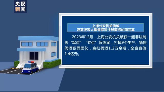 上海公安机关侦破范某波等人销售假冒注册商标的商品案。2023年12月,上海公安机关破获一起非法制售“军供”“专供”假酒案,打掉9个生产、销售假酒犯罪团伙,查扣假酒1.2万余瓶,全案案值1.4亿元。