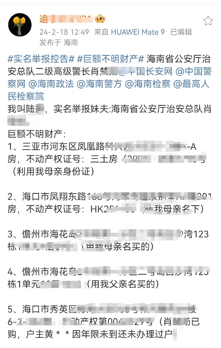 “我叫陆某,实名举报妹夫,海南省公安厅治安总队肖某某。”举报者在网上晒出的身份证显示,陆某,女,1962年出生,海南省海口市人。举报信中列举了肖某用父母及丈人丈母娘身份,在海南三亚、海口、儋州多地购买了8处房产,其中在澄迈靠海口地段还有一套别墅。“让我母亲替存赃款76万,妹妹在珠宝店还有股份,还利用我母亲的账户炒股。”
