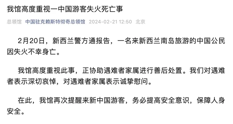 都市快报消息,据中国驻克赖斯特彻奇总领馆,2月20日,新西兰警方通报告,一名来新西兰南岛旅游的中国公民因失火不幸身亡。