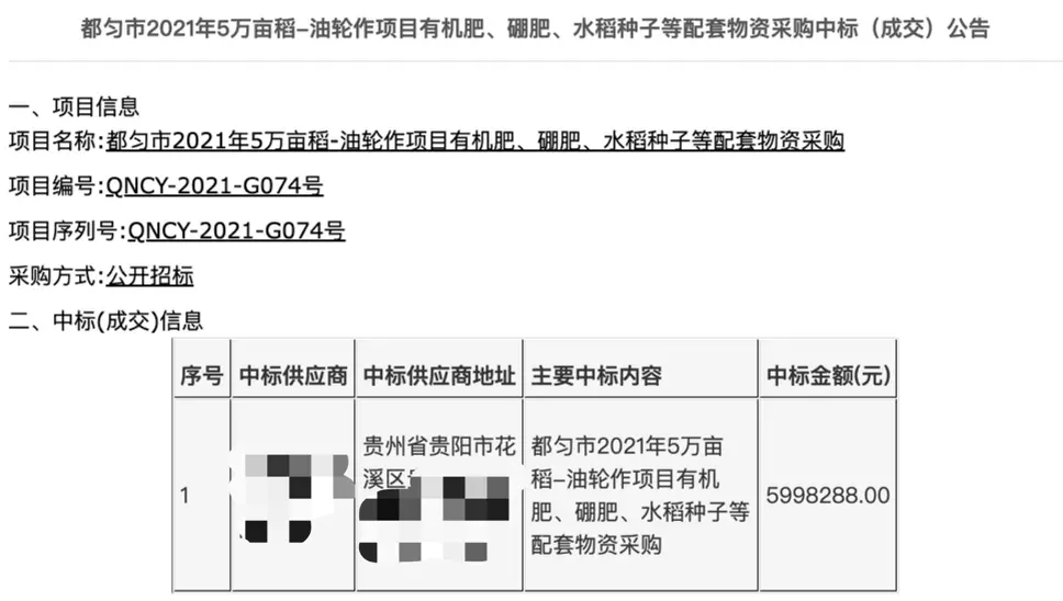 继续检索发现,唐某某参与评标的项目为《都匀市2021年5万亩稻-油轮作项目有机肥、硼肥、水稻种子等配套物资采购》,该项目中标金额为5998288元。