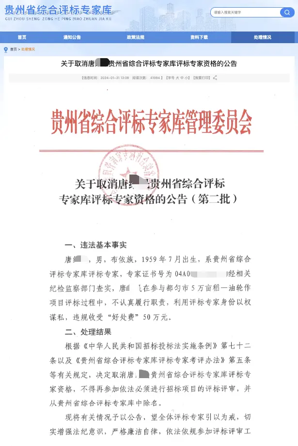 2月21日,每经小编从贵州省综合评标专家库官网看到,上述披露的文件显示,唐某某,男,系贵州省综合评标专家库评标专家,经相关纪检监察部门查实,唐某某在参与都匀市5万亩稻一油轮作项目评标过程中,不认真履行职责,利用评标专家身份以权谋私,违规收受“好处费”50万元。