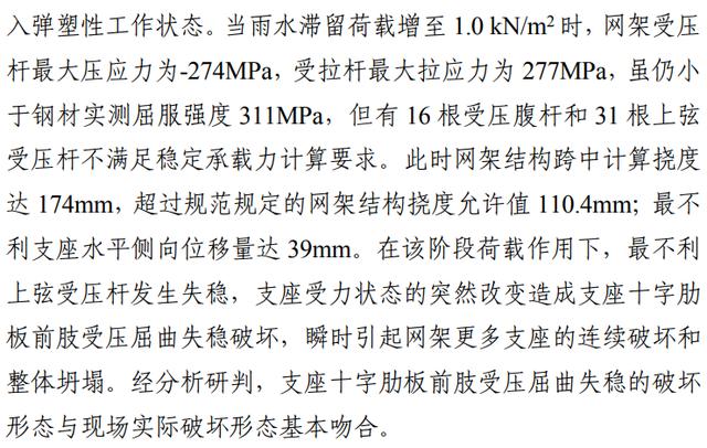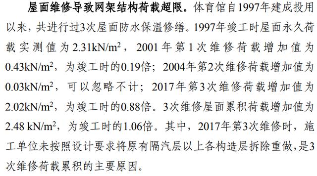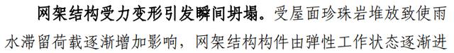 屋面多次维修大量增加荷载、屋面堆放珍珠岩及因珍珠岩堆放造成雨水滞留不断增加荷载,综合作用下网架结构严重超载、变形,导致屋顶瞬间坍塌。