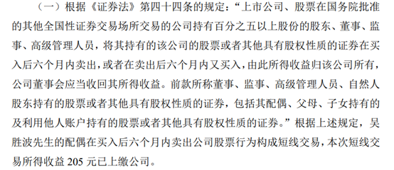 致歉公告显示,公司副董事长吴胜波配偶王嘉玮于2024年2月5日至2月19日期间存在买卖公司股票行为。根据相关规定,构成短线交易。依据《证券法》相关规定,所获收益205元已经全部上缴公司。