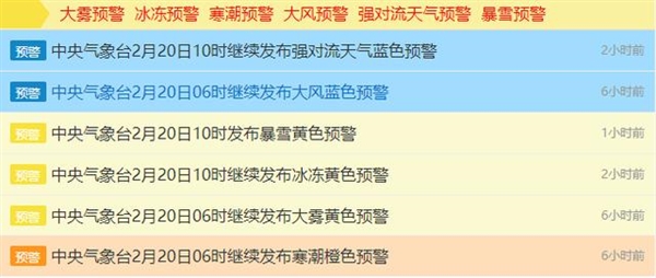 2月20日消息,近日龙年首轮寒潮开始发力,今早中央气象台再次6预警连发,包括寒潮橙色预警;大雾、冰冻黄色预警;暴雪、强对流天气、大风蓝色预警。
