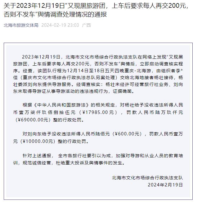 北海市文化市场综合行政执法支队2月19日晚发布通报,2023年12月19日,北海市文化市场综合行政执法支队在网络上发现“又现黑旅游团,上车后要求每人再交200元,否则不发车”舆情后,立即启动调查核实程序。经查,该团队行程为12月14日至18日五天四晚重庆-北海游,由组织者李*佳(重庆市文化市场综合行政执法总队另案处理)交给北海地接者杨壮接待,杨壮委派刘向东提供导游服务。经调查核实:杨壮未经许可经营旅行社业务、刘向东未取得导游证从事导游活动的违法违规行为,证据确凿。
