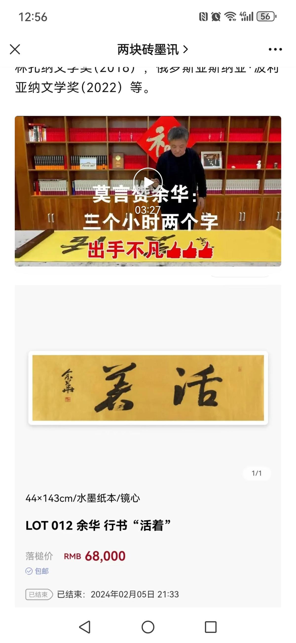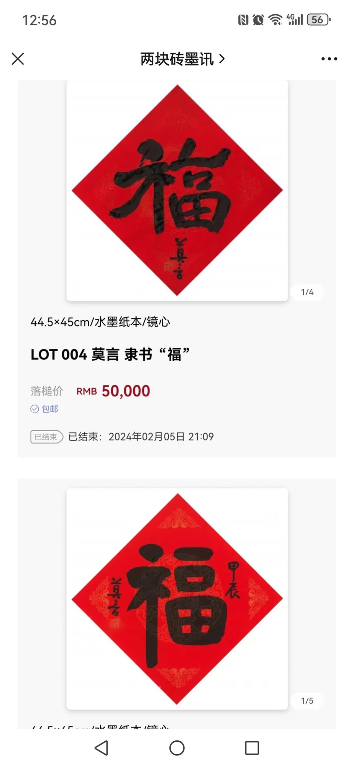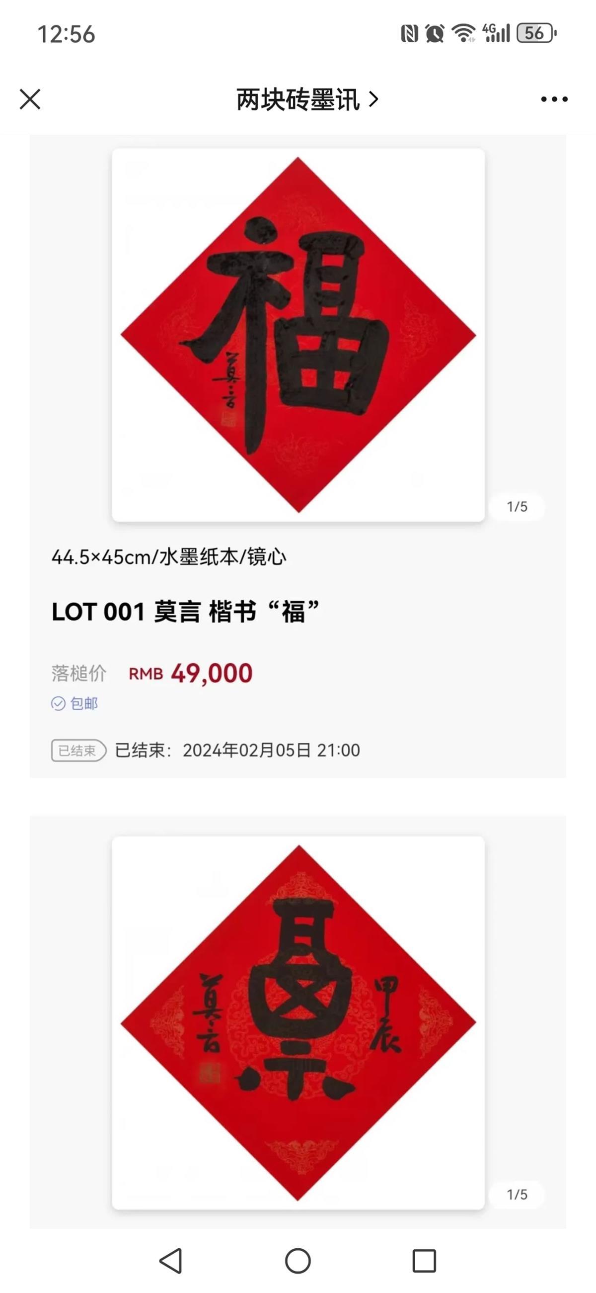 极目新闻记者看到,莫言手书的五个“福”,共拍出251000元,莫言的隶书《人寿年丰》拍出99000元,莫言的行书《福寿康宁》拍出102000元,莫言行书《紫气东来》《花开富贵》《心想事成》《喜上眉梢》各以80000元价格落槌成交。著名作家余华的行书《活着》拍出68000元,评论家谢有顺的行书《长风万里》以9500元落槌成交,还有鲁奖作家李浩的《载渔过江图》以3500元成交,茅奖作家徐则臣的行书录长篇小说《北上》句以8500元成交。书法家王振的行书录苏东坡《定风波》四屏拍出108000元……