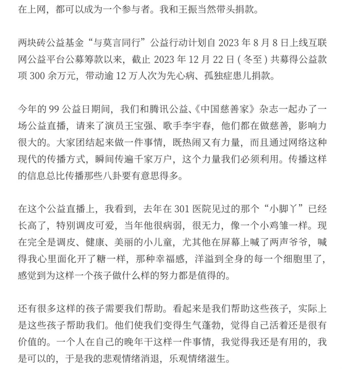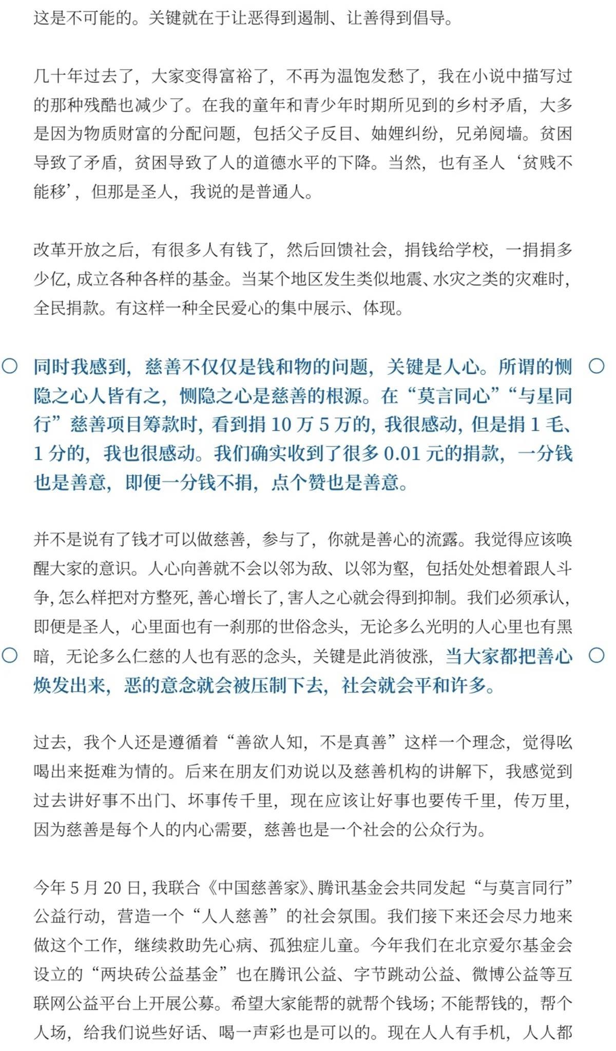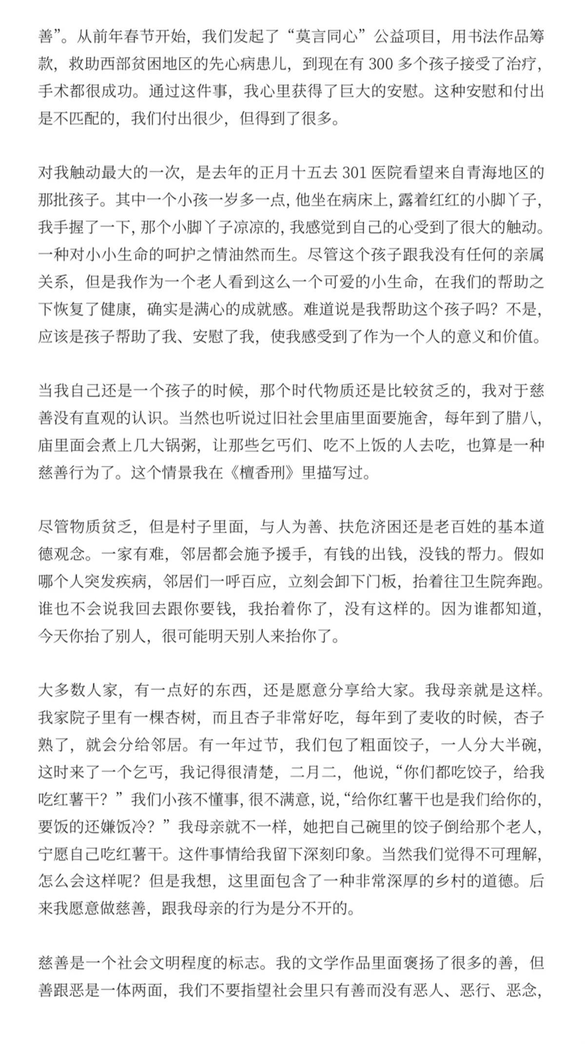 莫言在《手书迎甲辰新春慈善拍卖小记》中写道:“古人云:救人一命,胜造七级浮屠,能使四十个孩子恢复健康,其善也大焉。吾等文人,虽不能如大富豪壮捐亿万,但发挥一技之长帮助需要帮助的孩子们,是我们力所能及也是心甘情愿的。即便有人讽刺挖苦,我们也乐此不疲。”