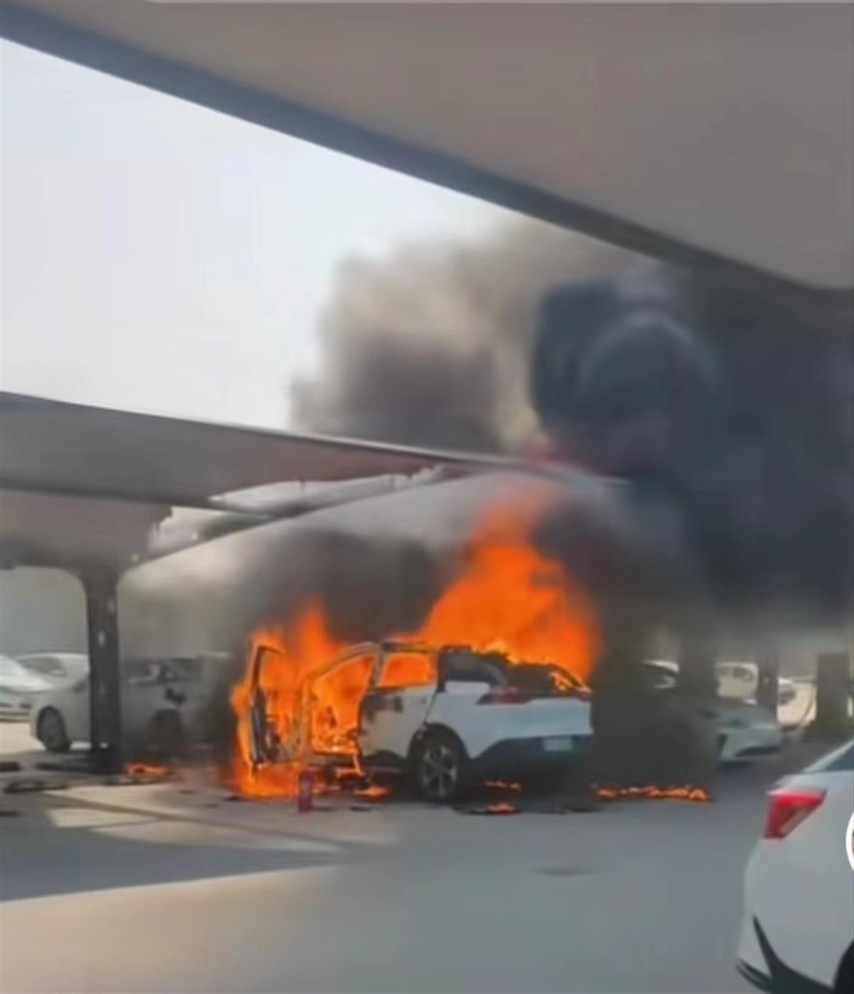 视频显示,现场已升起滚滚黑烟,车内部燃起熊熊火焰,烧得只剩下一个车架子,旁边还有其他电车在充电。