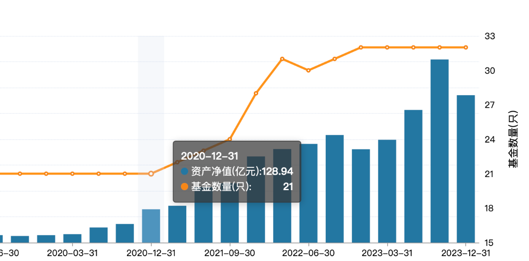 Wind数据显示,2023年三季度末,泰信基金资产净值创历史新高,达708.91亿元。截至2023年四季度末,尽管泰信基金资产净值回落至570.36亿元,但仍较2020年12月末时的128.94亿元增长了342.35%。