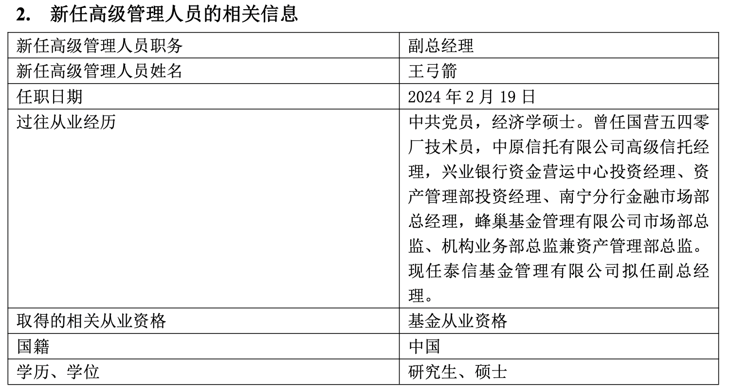 2月20日,泰信基金发布两则高级管理人员变更公告。据公告,自2024年2月19日起,公司副总经理张秉麟升任总经理,新任王弓箭为公司副总经理。