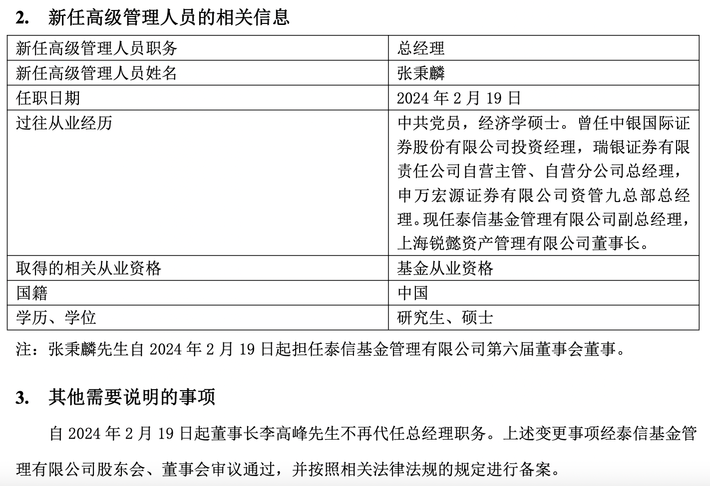 2月20日,泰信基金发布高级管理人员变更公告。根据公告内容,自2024年2月19日起,原为泰信基金副总经理的张秉麟升任总经理,董事长李高峰不再代任总经理职务。