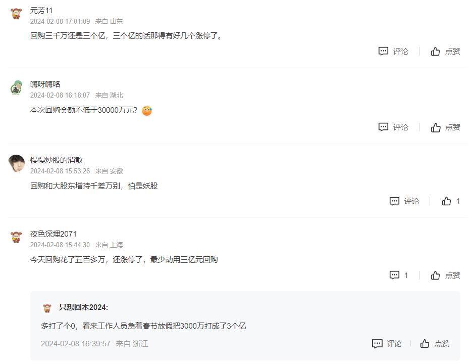 有投资者调侃称,“多打了个0,看来工作人员急着春节放假把3000万打成了3个亿”。来源:东方财富股吧