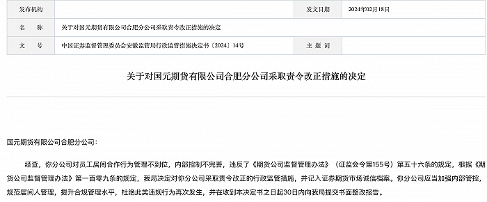 行政监管决定书显示,国元期货合肥分公司对员工居间合作行为管理不到位,内部控制不完善,违反了《期货公司监督管理办法》(证监会令第155号)第五十六条的规定。安徽证监局决定对其采取责令改正的行政监管措施,并记入证券期货市场诚信档案,监管要求国元期货合肥分公司应当加强内部管控,规范居间人管理,提升合规管理水平,杜绝此类违规行为再次发生,并在收到决定书之日起30日内提交书面整改报告。