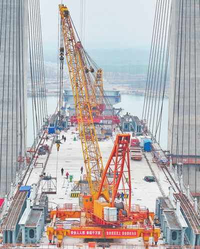 2月18日,湖北省襄阳市牛首汉江特大桥施工现场,施工人员在进行吊装作业。