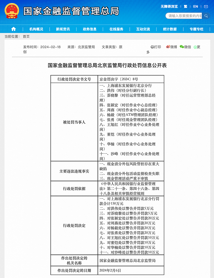 2月18日,国家金融监督管理总局北京监管局发布行政处罚信息公开表显示,上海浦东发展银行北京分行因三项主要违法违规事实被罚款合计150万元。