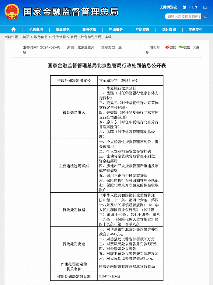 行政处罚信息公开表显示,华夏银行北京分行涉及的主要违法违规事实有:个人经营性贷款管理不到位,资金被挪用;个人农业担保贷款存贷挂钩;流动资金贷款贷后管理不到位,资金被挪用;房地产开发贷款管理严重违反审慎经营规则;采用不正当手段发放贷款;保险销售行为可回溯管理不规范;保险代理未开立独立的佣金收取账户。作出处罚决定的日期为2月6日。