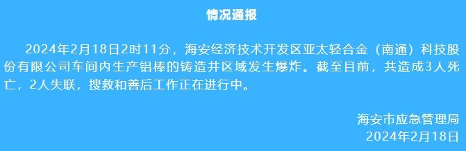 海安应急管理微信公众号发布情况通报,2024年2月18日2时11分,海安经济技术开发区亚太轻合金(南通)科技股份有限公司车间内生产铝棒的铸造井区域发生爆炸。截至目前,共造成3人死亡,2人失联,搜救和善后工作正在进行中。